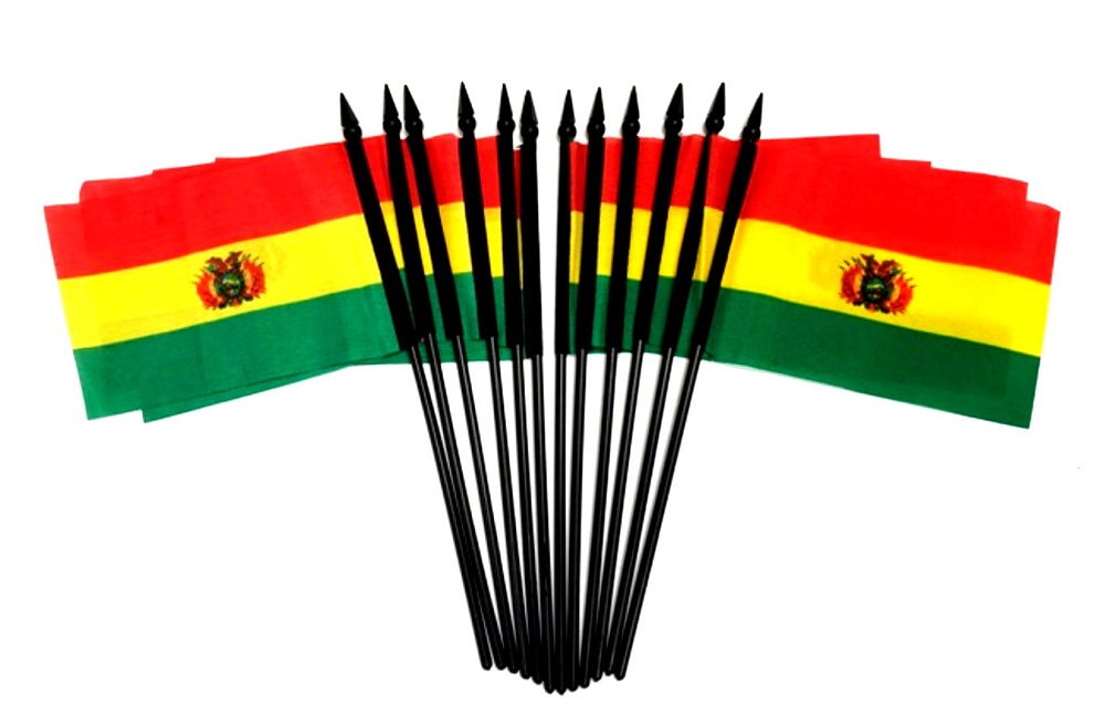 Bolivia Miniature 4"x6" flags are attached to a 10" black plastic staff with a spear top. These small mini table flags are perfect for special events, classroom use, international theme parties and home or office decoration.