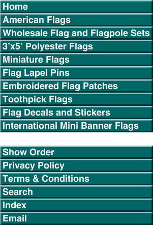 If you can not meet the $20.00 minimum for wholesale pricing on this site or do not see the product you need here, please visit our low price specialty retail sites for polyester flags, miniature flags, flag patches, flag stickers and flag lapel pins and more.